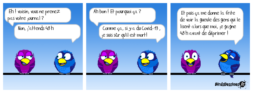 Case 1:Bird 1: Eh ! voisin, vous ne prenez pas votre journal ?Bird 2: Non, j'attends 48 h | Case 2: Bird 1: Ah bon ! Et pourquoi ça ? Bird 2: Comme ça, si y a du Covid-19 , je suis sûr qu'il est mort! | Case 3: Bird 1: Et puis ça me donne la frite de voir la gueule des gens qui le lisent alors que moi, je gagne 48 h avant de déprimer !