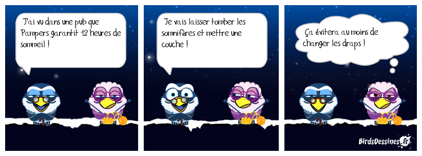 Case 1:Bird 1: J'ai vu dans une pub que Pampers garantit 12 heures de sommeil ! | Case 2: Bird 1: Je vais laisser tomber les somnifères et mettre une couche ! | Case 3: Bird 1: Ça évitera au moins de changer les draps !