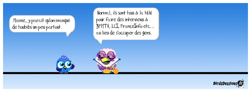 Case 1:Bird 1: Mamie, y parait qu'on manque de toubibs un peu partout. | Case 2: Bird 1: Normal, ils sont tous à la télé pour faire des interviews à BFMTV, LCI, FranceInfo etc... au lieu de s'occuper des gens. | Case 3: