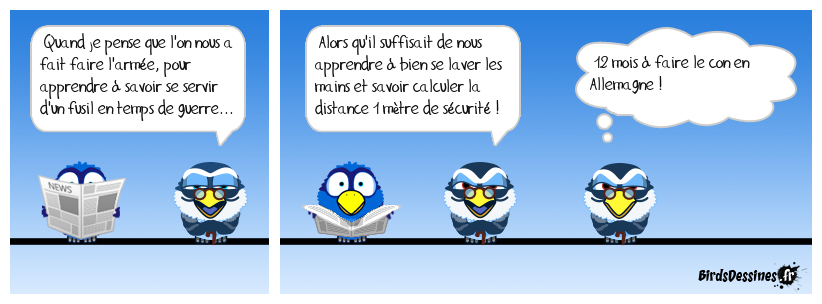 Case 1:Bird 1: Quand je pense que l'on nous a fait faire l'armée, pour apprendre à savoir se servir d'un fusil en temps de guerre... | Case 2: Bird 1: Alors qu'il suffisait de nous apprendre à bien se laver les mains et savoir calculer la distance 1 mètre de sécurité ! | Case 3: Bird 1: 12 mois à faire le con en Allemagne !