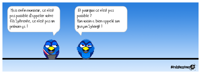 Case 1:Bird 1: Mais enfin monsieur, ce n'est pas possible d'appeler votre fils Syltrente, ce n'est pas un prénom ça ! | Case 2: Bird 1: Et pourquoi ce n'est pas possible ? Mon voisin a bien appelé son garçon Sylvingt ! | Case 3: