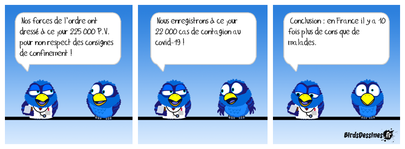 Case 1:Bird 1: Nos forces de l’ordre ont dressé à ce jour 225 000 P.V. pour non respect des consignes de confinement ! | Case 2: Bird 1: Nous enregistrons à ce jour 22 000 cas de contagion au covid-19 ! | Case 3: Bird 1: Conclusion : en France il y a 10 fois plus de cons que de malades.