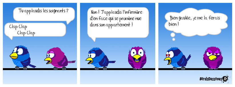 Case 1:Bird 1: Tu applaudis les soignants ?Bird 2: Clap Clap Clap Clap | Case 2: Bird 1: Non ! J'applaudis l'infirmière d'en face qui se promène nue dans son appartement ! | Case 3: Bird 1: Bien gaulée, je me la ferais bien !