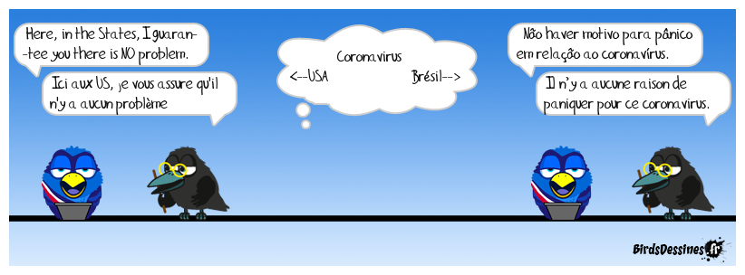 Case 1:Bird 1: Here, in the States, I guaran- -tee you there is NO problem.Bird 2: Ici aux US, je vous assure qu'il n'y a aucun problème | Case 2: Bird 1: Coronavirus <--USA Brésil--> | Case 3: Bird 1: Não haver motivo para pânico em relação ao coronavírus. Bird 2: Il n’y a aucune raison de paniquer pour ce coronavirus.