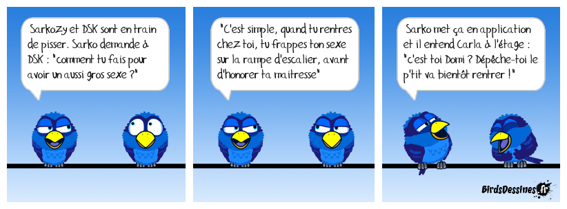 Case 1:Bird 1: Sarkozy et DSK sont en train de pisser. Sarko demande à DSK : "comment tu fais pour avoir un aussi gros sexe ?" | Case 2: Bird 1: "C'est simple, quand tu rentres chez toi, tu frappes ton sexe sur la rampe d'escalier, avant d'honorer ta maitresse" | Case 3: Bird 1: Sarko met ça en application et il entend Carla à l'étage : "c'est toi Domi ? Dépêche-toi le p'tit va bientôt rentrer !"