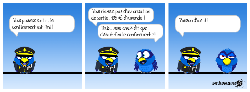 Case 1:Bird 1: Vous pouvez sortir, le confinement est fini ! | Case 2: Bird 1: Vous n'avez pas d'autorisation de sortie, 135 € d'amende ! Bird 2: Mais...vous avez dit que c'était fini le confinement ?! | Case 3: Bird 1: Poisson d'avril !