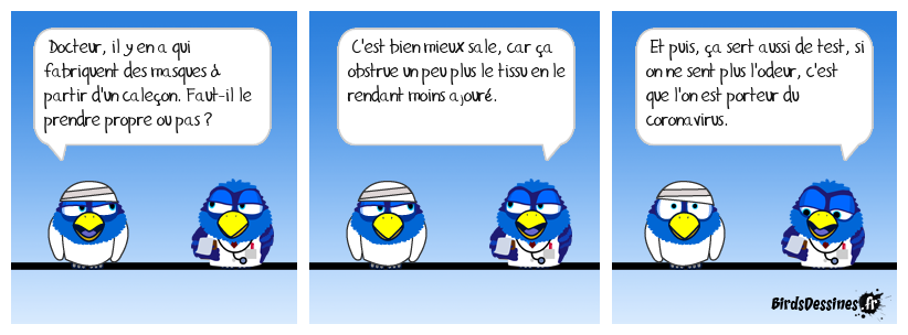 Case 1:Bird 1: Docteur, il y en a qui fabriquent des masques à partir d'un caleçon. Faut-il le prendre propre ou pas ? | Case 2: Bird 1: C'est bien mieux sale, car ça obstrue un peu plus le tissu en le rendant moins ajouré. | Case 3: Bird 1: Et puis, ça sert aussi de test, si on ne sent plus l'odeur, c'est que l'on est porteur du coronavirus.