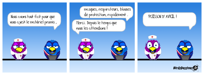 Case 1:Bird 1: Nous avons tout fait pour que vous ayez le matériel promis , | Case 2: Bird 1: masques, respirateurs, blouses de protection, rapidement . Bird 2: Merci. Depuis le temps que nous les attendions ! | Case 3: Bird 1: POISSON D' AVRIL !
