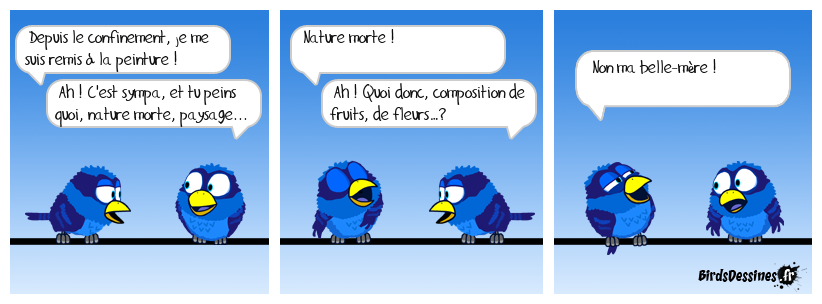 Case 1:Bird 1: Depuis le confinement, je me suis remis à la peinture !Bird 2: Ah ! C'est sympa, et tu peins quoi, nature morte, paysage... | Case 2: Bird 1: Nature morte ! Bird 2: Ah ! Quoi donc, composition de fruits, de fleurs…? | Case 3: Bird 1: Non ma belle-mère !