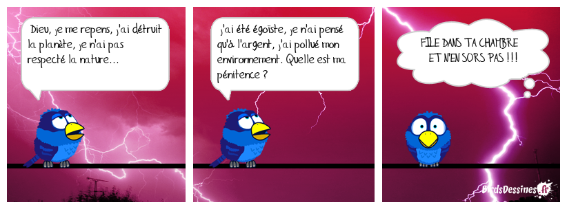 Case 1:Bird 1: Dieu, je me repens, j'ai détruit la planète, je n'ai pas respecté la nature... | Case 2: Bird 1: j'ai été égoîste, je n'ai pensé qu'à l'argent, j'ai pollué mon environnement. Quelle est ma pénitence ? | Case 3: Bird 1: FILE DANS TA CHAMBRE ET N'EN SORS PAS !!!