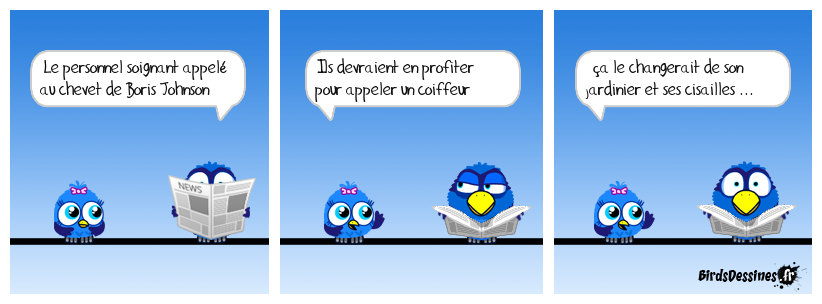 Case 1:Bird 1: Le personnel soignant appelé au chevet de Boris Johnson | Case 2: Bird 1: Ils devraient en profiter pour appeler un coiffeur | Case 3: Bird 1: ça le changerait de son jardinier et ses cisailles ...