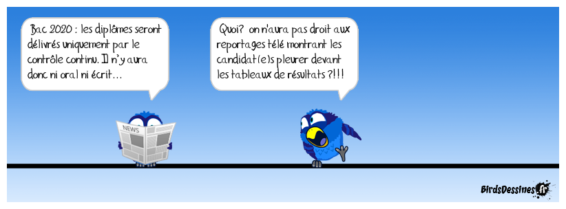 Case 1:Bird 1: Bac 2020 : les diplômes seront délivrés uniquement par le contrôle continu. Il n’y aura donc ni oral ni écrit... | Case 2: Bird 1: Quoi? on n'aura pas droit aux reportages télé montrant les candidat(e)s pleurer devant les tableaux de résultats ?!!! | Case 3: