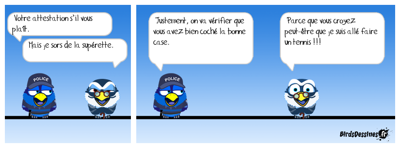 Case 1:Bird 1: Votre attestation s’il vous plaït.Bird 2: Mais je sors de la supérette. | Case 2: Bird 1: Justement, on va vérifier que vous avez bien coché la bonne case. | Case 3: Bird 1: Parce que vous croyez peut-être que je suis allé faire un tennis !!!