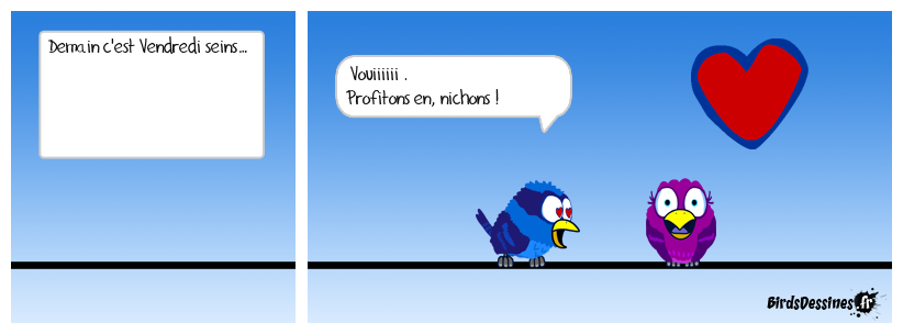 Case 1:Bird 1: Demain c'est Vendredi seins… | Case 2: Bird 1: Vouiiiiii . Profitons en, nichons ! | Case 3: