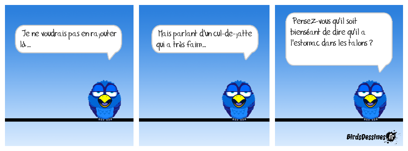 Case 1:Bird 1: Je ne voudrais pas en rajouter là… | Case 2: Bird 1: Mais parlant d'un cul-de-jatte qui a très faim… | Case 3: Bird 1: Pensez-vous qu'il soit bienséant de dire qu'il a l'estomac dans les talons ?