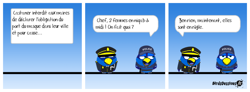 Case 1:Bird 1: Castaner interdit aux maires de déclarer l'obligation du port du masque dans leur ville et pour cause... | Case 2: Bird 1: Chef, 2 femmes en niqab à midi ! On fait quoi ? | Case 3: Bird 1: Ben rien, maintenant, elles sont en règle.