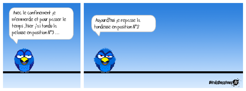 Case 1:Bird 1: Avec le confinement je m'emmerde et pour passer le temps ,hier j'ai tondu la pelouse en position N°3 ... | Case 2: Bird 1: Aujourd'hui je repasse la tondeuse en position N°2 | Case 3: