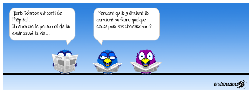 Case 1:Bird 1: Boris Johnson est sorti de l'hôpital. Il remercie le personnel de lui avoir sauvé la vie…. | Case 2: Bird 1: Pendant qu'ils y étaient ils auraient pu faire quelque chose pour ses cheveux non ? | Case 3:
