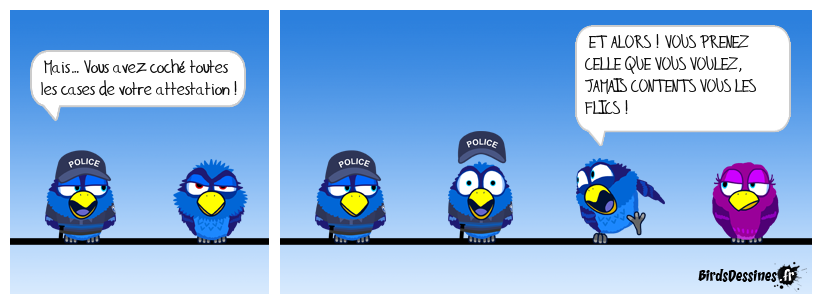 Case 1:Bird 1: Mais… Vous avez coché toutes les cases de votre attestation ! | Case 2: | Case 3: Bird 1: ET ALORS ! VOUS PRENEZ CELLE QUE VOUS VOULEZ, JAMAIS CONTENTS VOUS LES FLICS !