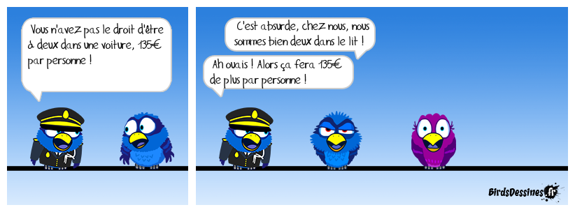 Case 1:Bird 1: Vous n'avez pas le droit d'être à deux dans une voiture, 135€ par personne ! | Case 2: Bird 1: C'est absurde, chez nous, nous sommes bien deux dans le lit ! Bird 2: Ah ouais ! Alors ça fera 135€ de plus par personne ! | Case 3: