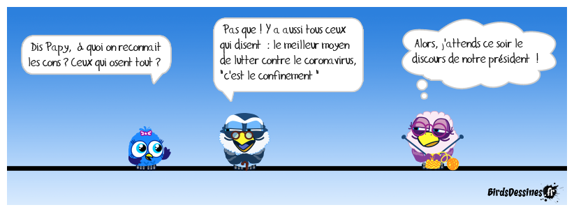 Case 1:Bird 1: Dis Papy, à quoi on reconnait les cons ? Ceux qui osent tout ? | Case 2: Bird 1: Pas que ! Y a aussi tous ceux qui disent : le meilleur moyen de lutter contre le coronavirus, "c'est le confinement " | Case 3: Bird 1: Alors, j'attends ce soir le discours de notre président !