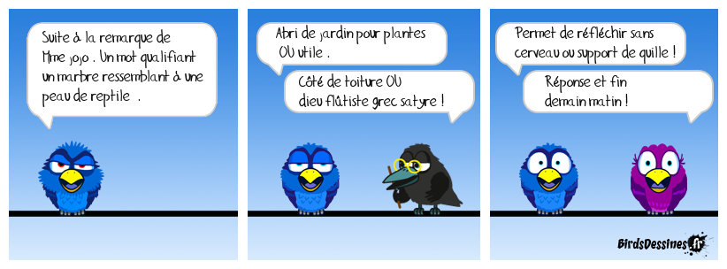 Case 1:Bird 1: Suite à la remarque de Mme jojo . Un mot qualifiant un marbre ressemblant à une peau de reptile . | Case 2: Bird 1: Abri de jardin pour plantes OU utile . Bird 2: Côté de toiture OU dieu flûtiste grec satyre ! | Case 3: Bird 1: Permet de réfléchir sans cerveau ou support de quille ! Bird 2: Réponse et fin demain matin !