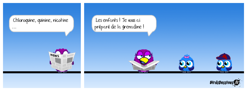 Case 1:Bird 1: Chloroquine, quinine, nicotine ... | Case 2: Bird 1: Les enfants ! Je vous ai préparé de la grenadine ! | Case 3: