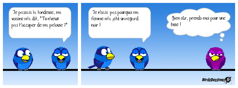 Case 1:Bird 1: Je passais la tondeuse, ma voisine m'a dit, "Tu n'veux pas t'occuper de ma pelouse ?" | Case 2: Bird 1: Je n'sais pas pourquoi ma femme m'a jeté un regard noir ! | Case 3: Bird 1: Bien sûr, prends-moi pour une buse !