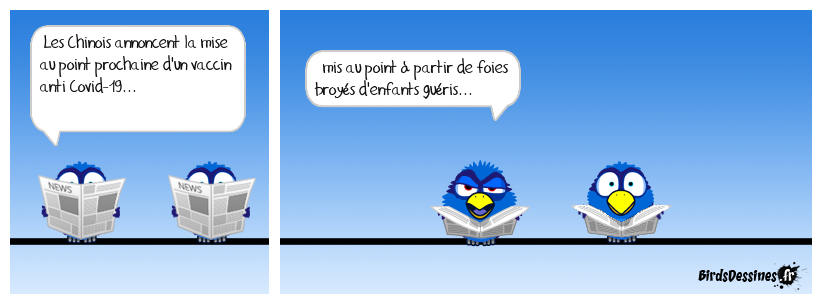 Case 1:Bird 1: Les Chinois annoncent la mise au point prochaine d'un vaccin anti Covid-19... | Case 2: Bird 1: mis au point à partir de foies broyés d'enfants guéris... | Case 3: