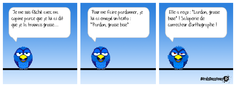 Case 1:Bird 1: Je me suis fâché avec ma copine parce que je lui ai dit que je la trouvais grosse... | Case 2: Bird 1: Pour me faire pardonner, je lui ai envoyé un texto : "Pardon, grosse bise" | Case 3: Bird 1: Elle a reçu : "Lardon, grosse buse" ! Saloperie de correcteur d'orthographe !