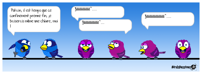 Case 1:Bird 1: Putain, il est temps que ce confinement prenne fin, je baiserais même une chèvre, moi ! | Case 2: Bird 1: Bêêêêêêêêê^.... Bird 2: Bêêêêêêêêêê^... | Case 3: Bird 1: Bêêêêêêêêêêêê^....