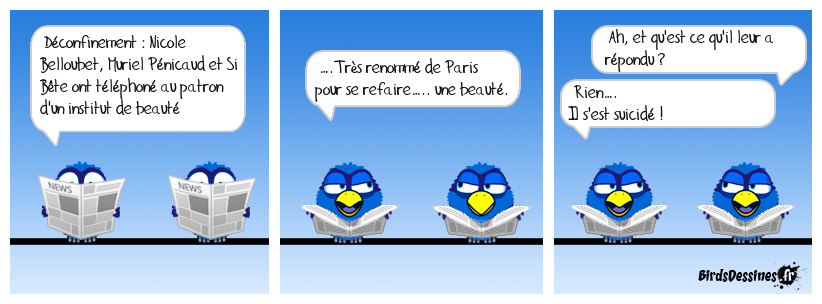 Case 1:Bird 1: Déconfinement : Nicole Belloubet, Muriel Pénicaud et Si Bête ont téléphoné au patron d'un institut de beauté | Case 2: Bird 1: ….Très renommé de Paris pour se refaire….. une beauté. | Case 3: Bird 1: Ah, et qu'est ce qu'il leur a répondu ? Bird 2: Rien…. Il s'est suicidé !