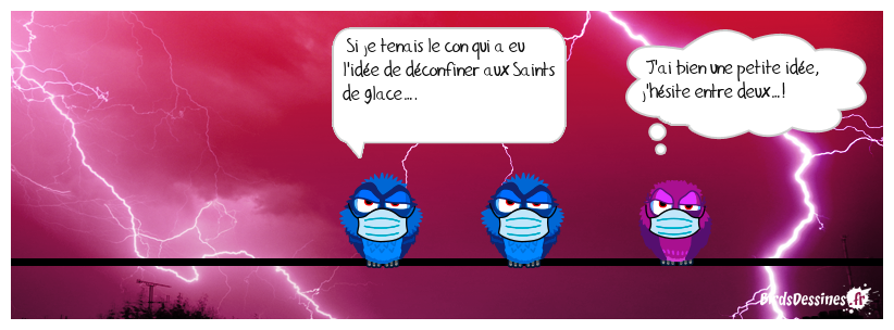 Case 1: | Case 2: Bird 1: Si je tenais le con qui a eu l'idée de déconfiner aux Saints de glace…. | Case 3: Bird 1: J'ai bien une petite idée, j'hésite entre deux…!