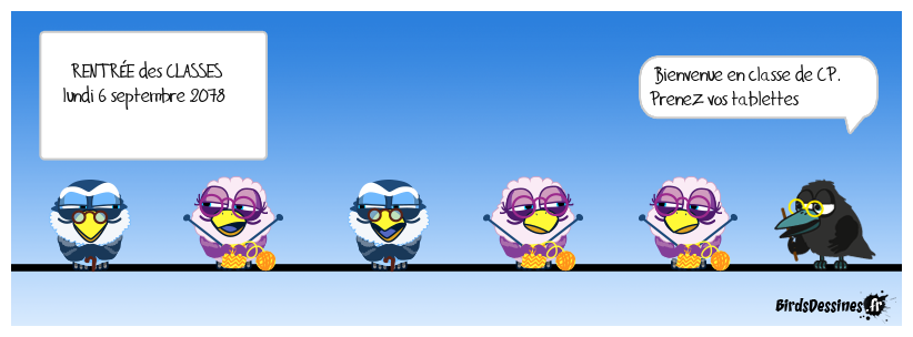 Case 1:Bird 1: RENTRÈE des CLASSES lundi 6 septembre 2078 | Case 2: | Case 3: Bird 1: Bienvenue en classe de CP. Prenez vos tablettes