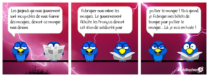 Case 1:Bird 1: Les guignols qui nous gouvernent sont incapables de nous fournir des masques, devant ce manque nous devons | Case 2: Bird 1: fabriquer nous même les masques. Le gouvernement félicite les Français devant cet élan de solidarité pour | Case 3: Bird 1: pallier le manque ! Mais quand je fabrique mes billets de banque pour pallier le manque...Là je vais en taule !