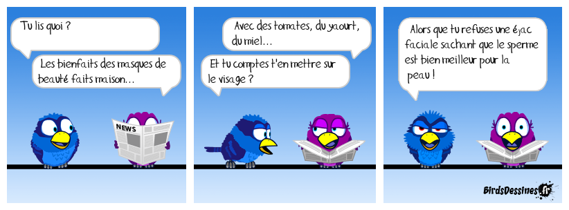 Case 1:Bird 1: Tu lis quoi ?Bird 2: Les bienfaits des masques de beauté faits maison... | Case 2: Bird 1: Avec des tomates, du yaourt, du miel... Bird 2: Et tu comptes t'en mettre sur le visage ? | Case 3: Bird 1: Alors que tu refuses une éjac faciale sachant que le sperme est bien meilleur pour la peau !