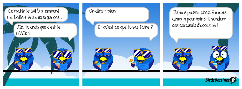 Case 1:Bird 1: Ce matin le SAMU a emmené ma belle-mère aux urgences...Bird 2: Aîe, tu crois que c'est le COVID ? | Case 2: Bird 1: On dirait bien. Bird 2: Et qu'est ce que tu vas faire ? | Case 3: Bird 1: Je vais passer chez Emmaüs demain pour voir s'ils vendent des cercueils d'occasion !