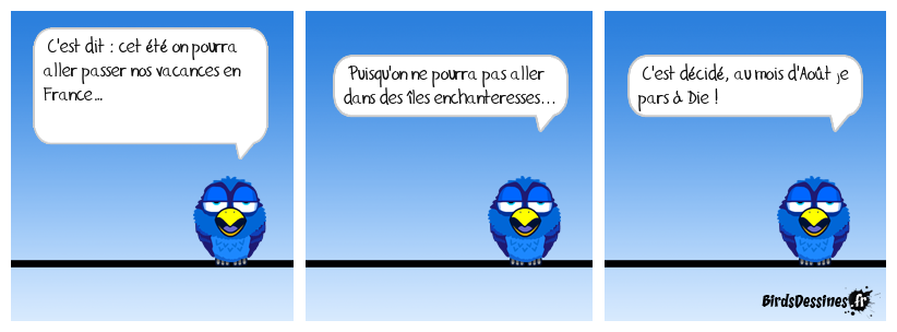 Case 1:Bird 1: C'est dit : cet été on pourra aller passer nos vacances en France… | Case 2: Bird 1: Puisqu'on ne pourra pas aller dans des ïles enchanteresses... | Case 3: Bird 1: C'est décidé, au mois d'Août je pars à Die !
