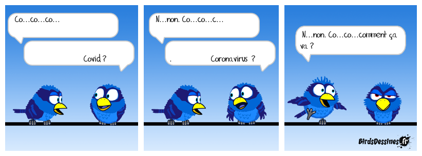Case 1:Bird 1: Co...co...co...Bird 2: Covid ? | Case 2: Bird 1: N...non. Co...co...c... Bird 2: . Coronavirus ? | Case 3: Bird 1: N...non. Co...co...comment ça va ?