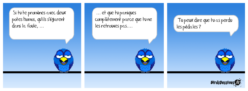 Case 1:Bird 1: Si tu te promènes avec deux potes homos, qu'ils s'égarent dans la foule, ... | Case 2: Bird 1: ... et que tu paniques complètement parce que tu ne les retrouves pas.... | Case 3: Bird 1: Tu peux dire que tu as perdu les pédales ?