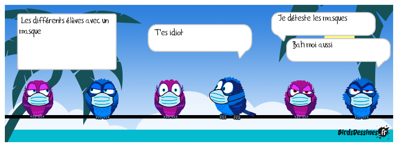 Case 1:Bird 1: Les différents élèves avec un masque | Case 2: Bird 1: T'es idiot | Case 3: Bird 1: Je déteste les masques Bird 2: Bah moi aussi