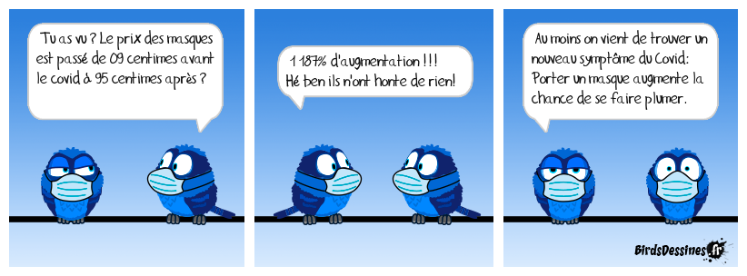 Case 1:Bird 1: Tu as vu ? Le prix des masques est passé de 09 centimes avant le covid à 95 centimes après ? | Case 2: Bird 1: 1 187% d'augmentation !!! Hé ben ils n'ont honte de rien! | Case 3: Bird 1: Au moins on vient de trouver un nouveau symptôme du Covid: Porter un masque augmente la chance de se faire plumer.