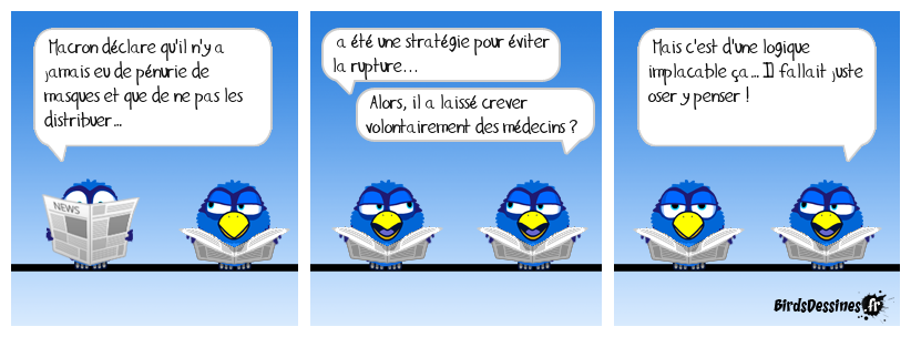 Case 1:Bird 1: Macron déclare qu'il n'y a jamais eu de pénurie de masques et que de ne pas les distribuer… | Case 2: Bird 1: a été une stratégie pour éviter la rupture... Bird 2: Alors, il a laissé crever volontairement des médecins ? | Case 3: Bird 1: Mais c'est d'une logique implacable ça… Il fallait juste oser y penser !