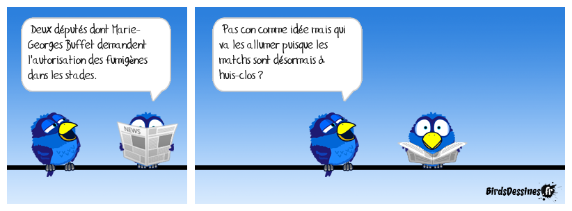 Case 1:Bird 1: Deux députés dont Marie- Georges Buffet demandent l'autorisation des fumigènes dans les stades. | Case 2: Bird 1: Pas con comme idée mais qui va les allumer puisque les matchs sont désormais à huis-clos ? | Case 3:
