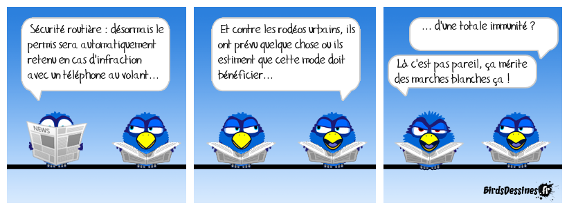 Case 1:Bird 1: Sécurité routière : désormais le permis sera automatiquement retenu en cas d'infraction avec un téléphone au volant... | Case 2: Bird 1: Et contre les rodéos urbains, ils ont prévu quelque chose ou ils estiment que cette mode doit bénéficier... | Case 3: Bird 1: ... d'une totale immunité ? Bird 2: Là c'est pas pareil, ça mérite des marches blanches ça !