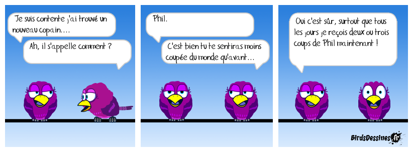Case 1:Bird 1: Je suis contente j'ai trouvé un nouveau copain....Bird 2: Ah, il s'appelle comment ? | Case 2: Bird 1: Phil. Bird 2: C'est bien tu te sentiras moins coupée du monde qu'avant... | Case 3: Bird 1: Oui c'est sûr, surtout que tous les jours je reçois deux ou trois coups de Phil maintenant !