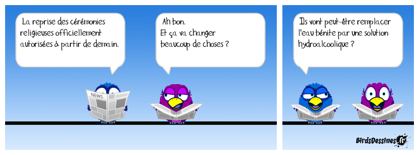 Case 1:Bird 1: La reprise des cérémonies religieuses officiellement autorisées à partir de demain. | Case 2: Bird 1: Ah bon. Et ça va changer beaucoup de choses ? | Case 3: Bird 1: Ils vont peut-être remplacer l'eau bénite par une solution hydroalcoolique ?