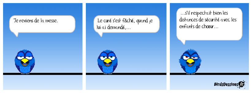 Case 1:Bird 1: Je reviens de la messe. | Case 2: Bird 1: Le curé s'est fâché, quand je lui ai demandé,... | Case 3: Bird 1: ...s'il respectait bien les distances de sécurité avec les enfants de chœur...