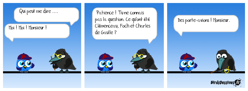 Case 1:Bird 1: Qui peut me dire ....Bird 2: Moi ! Moi ! Monsieur ! | Case 2: Bird 1: Patience ! Tu ne connais pas la question. Ce qu'ont été Clémenceau, Foch et Charles de Gaulle ? | Case 3: Bird 1: Des porte-avions ! Monsieur.