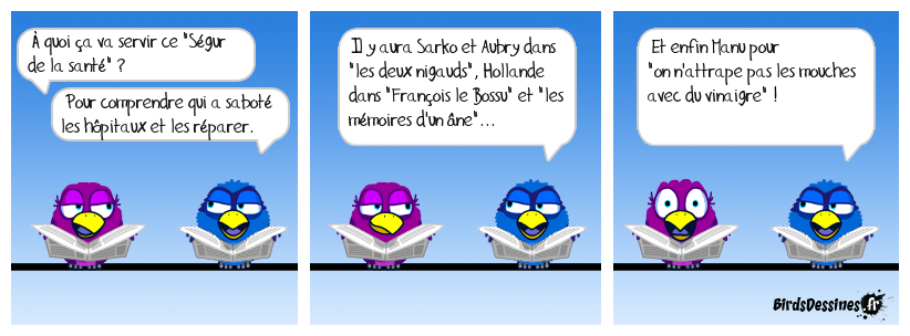 Case 1:Bird 1: À quoi ça va servir ce "Ségur de la santé" ? Bird 2: Pour comprendre qui a saboté les hôpitaux et les réparer. | Case 2: Bird 1: Il y aura Sarko et Aubry dans "les deux nigauds", Hollande dans "François le Bossu" et "les mémoires d'un âne"... | Case 3: Bird 1: Et enfin Manu pour "on n'attrape pas les mouches avec du vinaigre" !